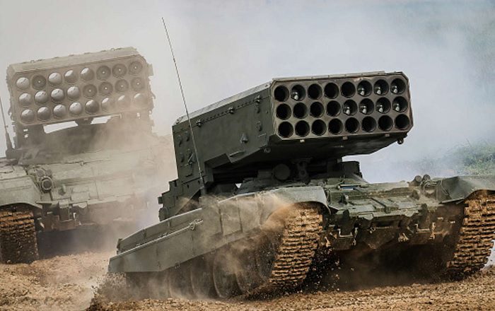 உக்ரைனிய தேசிய பாதுகாப்புப் படையின் 27வது தனிப்பிரிவின் தாக்குதல் யூனிட், களமுனையில் இருந்த இந்த TOS-1A அமைப்பைத் துல்லியமாகக் கண்காணித்துள்ளது.